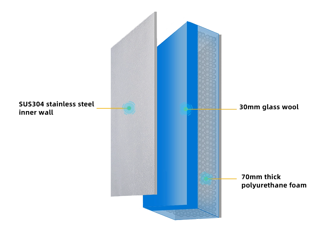 외벽의 소재는 고품질 냉압연강판으로 제작됐으며 단열구조는 강성 폴리우레탄 발포체과 유리울로 구성된 100mm 단열층으로 구성됐습니다. 이 단열층은 내부와 외부 환경을 효과적으로 격리하여 열교환을 방지하고 온도 변동을 ≤ 1.8 ℉(1℃) 범위 내로 유지합니다.