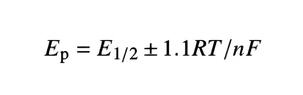 전위 차이는 스캔 속도와 무관합니다. 전기석출을 위한 불용성 필름의 가역 산화의 경우, 이 과정이 확산에 의해 제어되지 않는다면 ΔE 값은 식 (4)에서 제시된 값보다 훨씬 작을 것입니다.