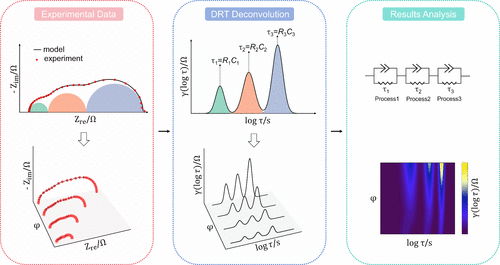 그림 3: 단일 임피던스 스펙트럼(상)과 다중 스펙트럼(하)을 서로 다른 이완 시간 분포로 변환하고, 이후 대응되는 전기화학 과정을 식별하는 개념도[9]